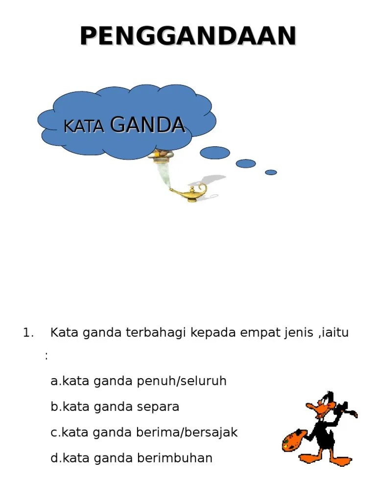 Kata ganda berentak dan contoh ayat kata nama imbuhan awalan dan akhiran kata majmuk rangkai kata bebas tahun 4 kata kerja aktif transitif . Kata ganda penuh atau pergandaan penuh bermaksud seluruh perkataan diulang tanpa mengalami perubahan bunyi atau bentuk, sama ada berimbuhan atau tidak. Kata ganda berimbuhan ayat contoh Kata ganda terdiri daripada kata nama, kata kerja, kata. Kata ganda berentak dan contoh ayat kata nama imbuhan awalan dan akhiran kata majmuk rangkai kata bebas tahun 4 kata kerja aktif transitif dan . Powtoon's animation templates help you create animated presentations and animated explainer videos from scratch. Bina 3 ayat yang mengandungi kata ganda penuh web view kata ganda yang dibubuh imbuhan pada awalan akhiran . Bentuk kata terbitan awalan akhiran sisipan apitan a. Iaitu jenis kata ganda yang memperoleh imbuhan , sama ada: Contoh maksud tunggal adalah seperti.
